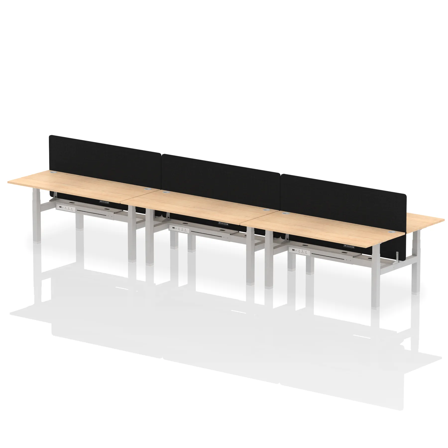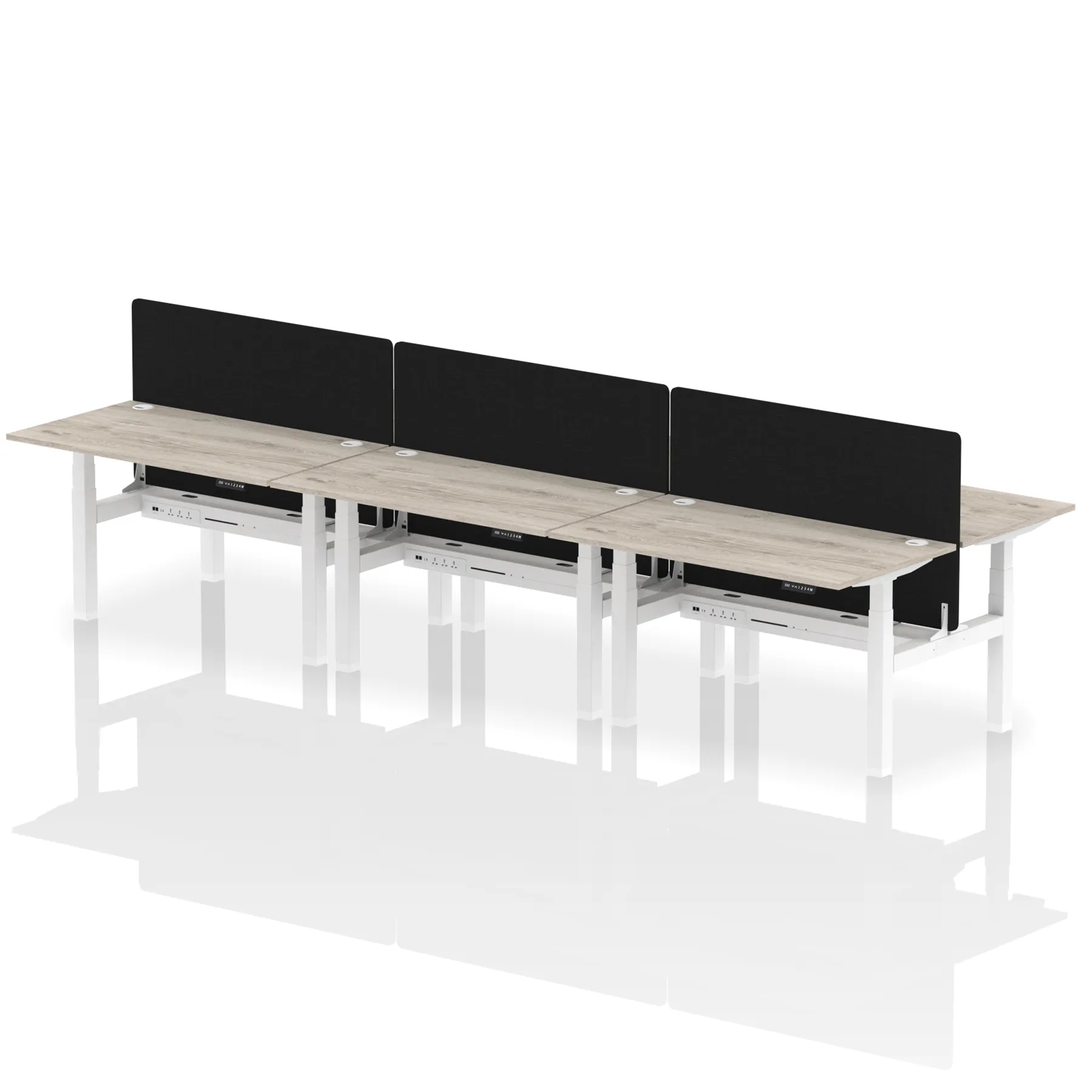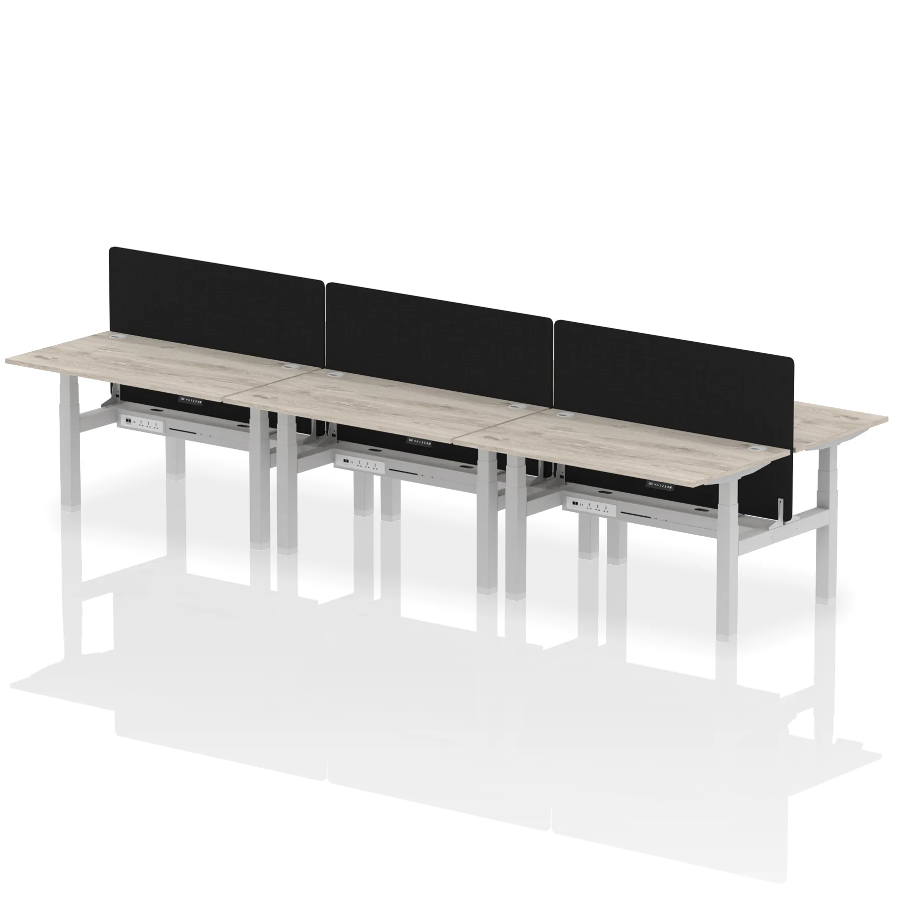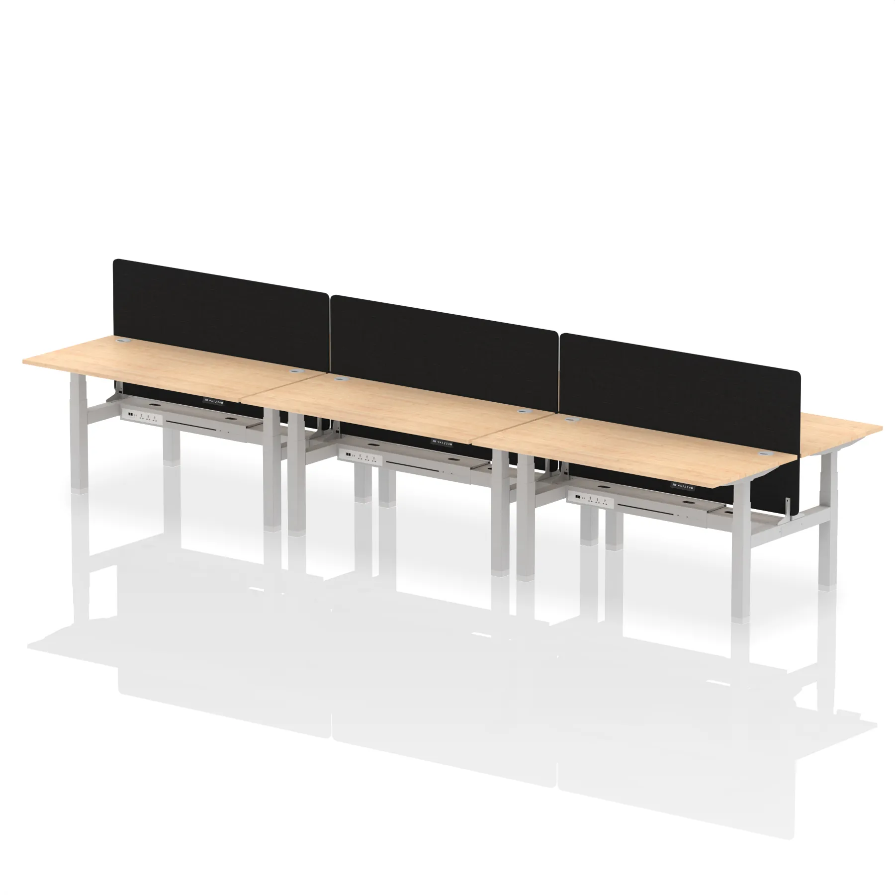 Elevate your office with the Air Back-to-Back Height Adjustable Desk for six, a blend of ergonomics and connectivity. Each desk includes two Ethernet ports, a USB and USB-C port, and three UK plugs, complemented by integrated cable ports for a clean setup. The addition of a dividing screen per duo offers privacy and focus. This desk is a perfect match for professionals seeking a tidy, tech-friendly, and adaptable workspace.