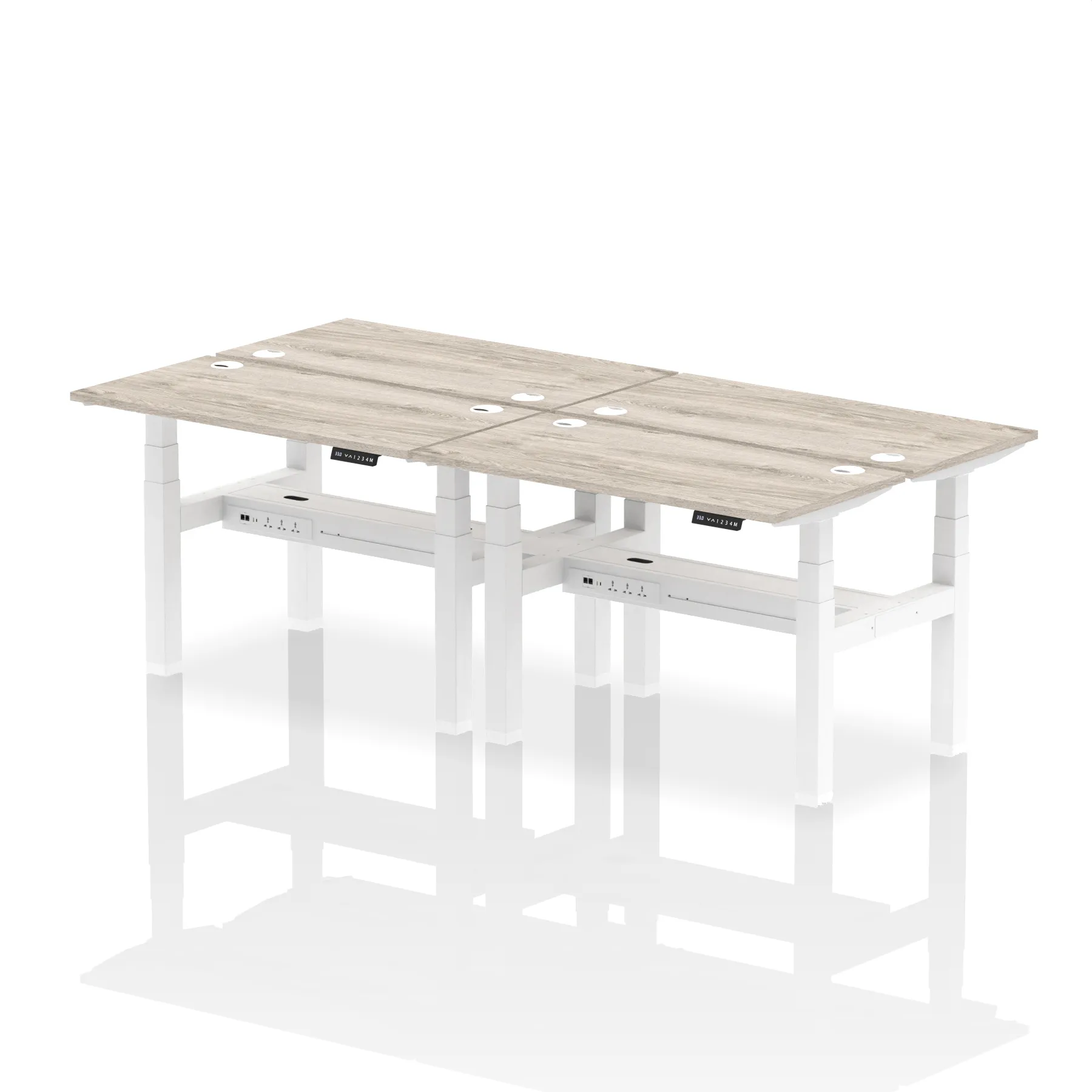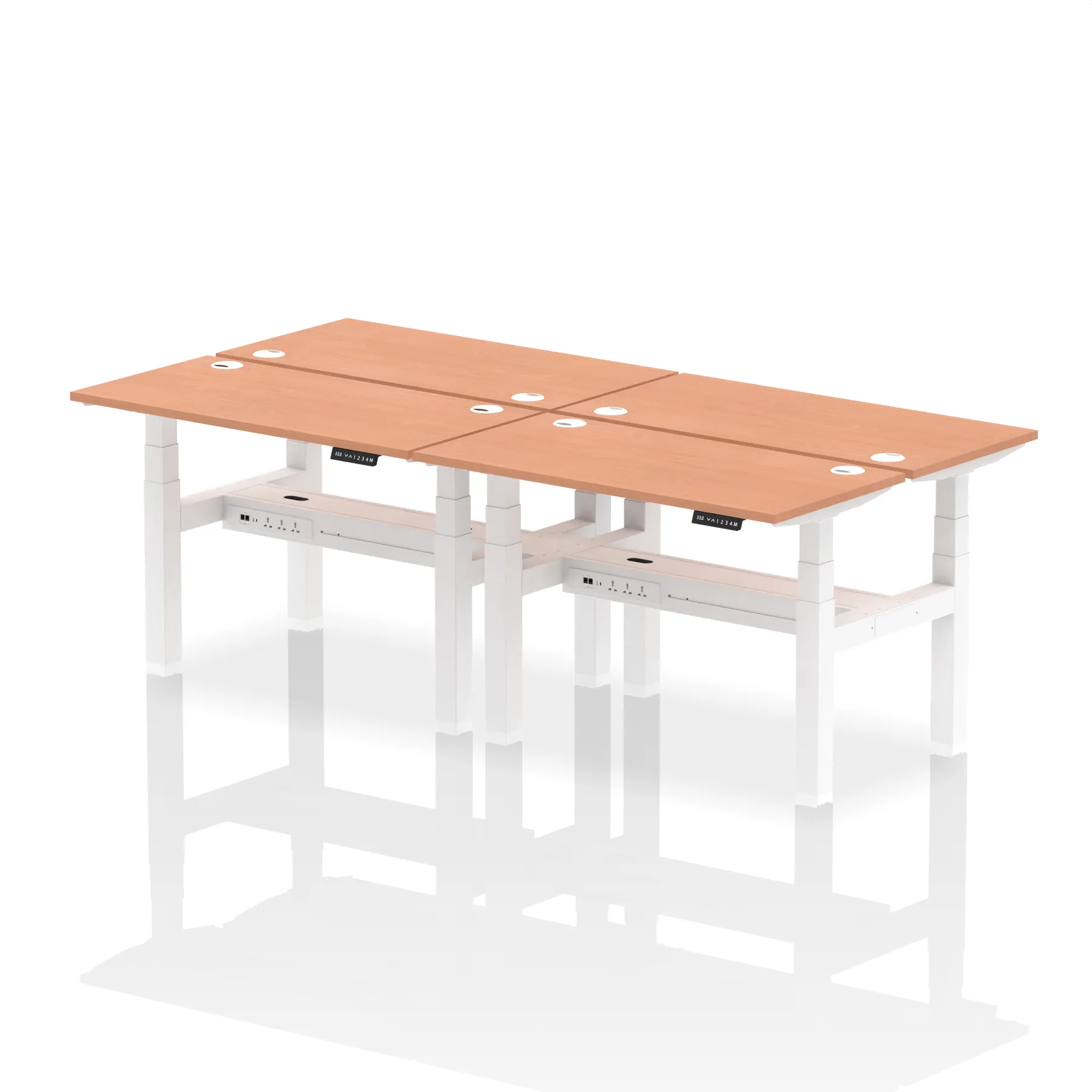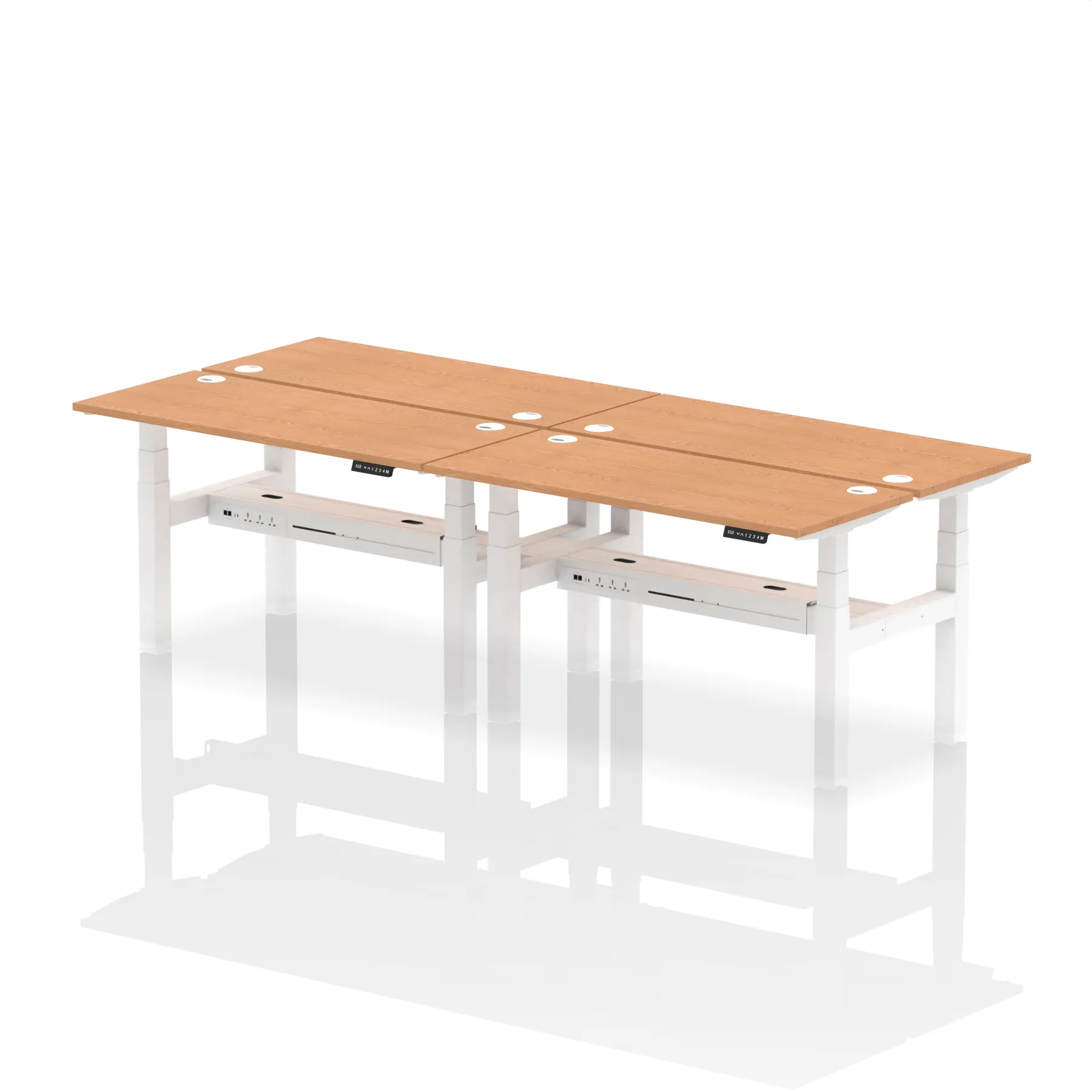Introducing the Air Back-to-Back Slimline Height Adjustable Desk, a sleek solution for four. Each desk features dual Ethernet ports, a USB port, a USB-C port, and three UK plugs, ensuring comprehensive connectivity. The design includes cable ports for a neat workspace. Its height-adjustable feature caters to ergonomic comfort. Ideal for teams seeking a streamlined and flexible working environment, this workstation redefines collaborative efficiency.
