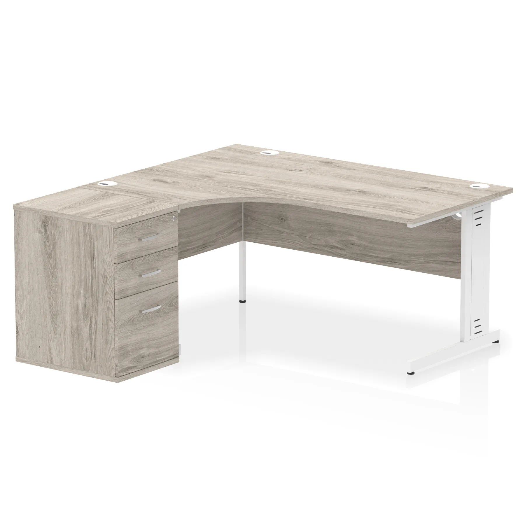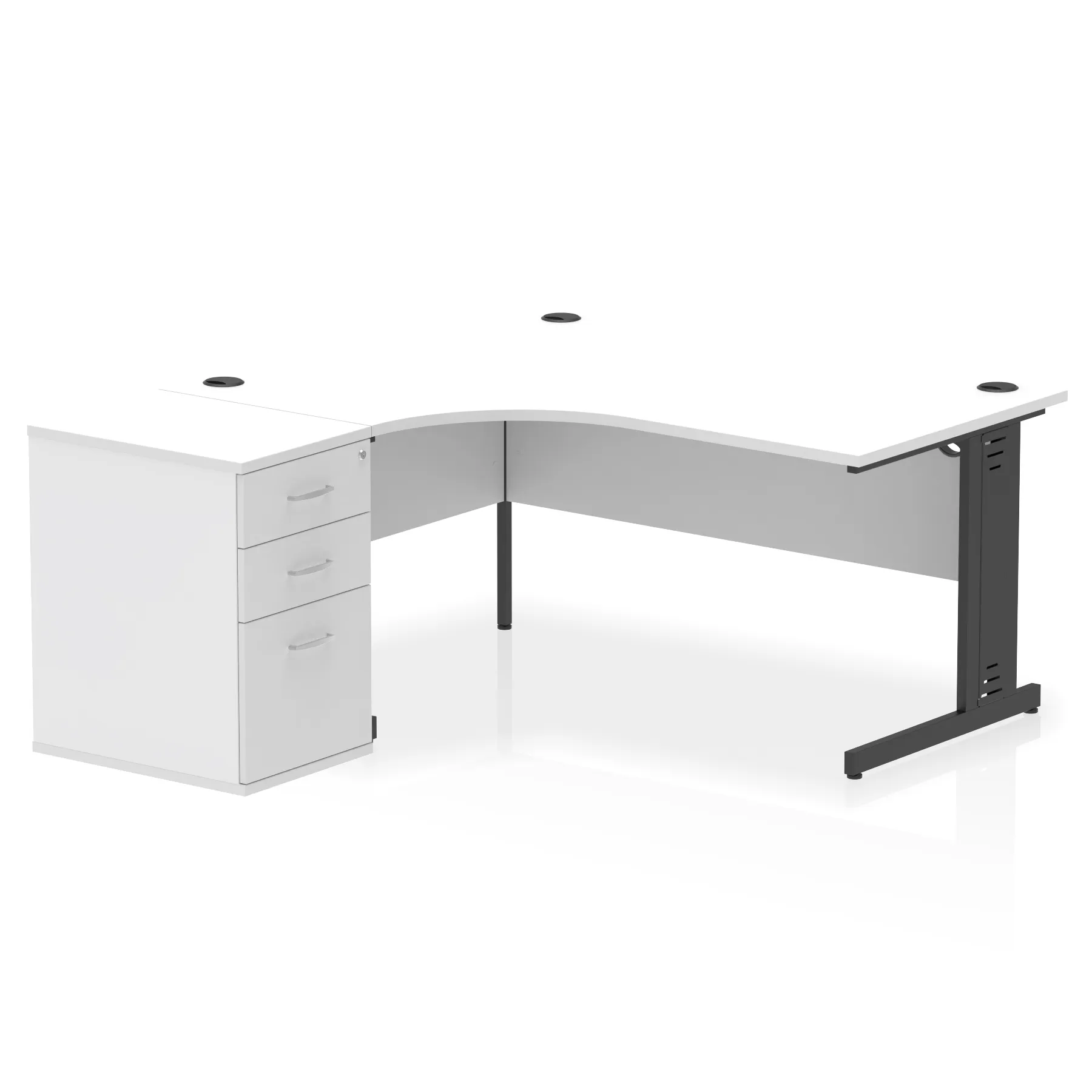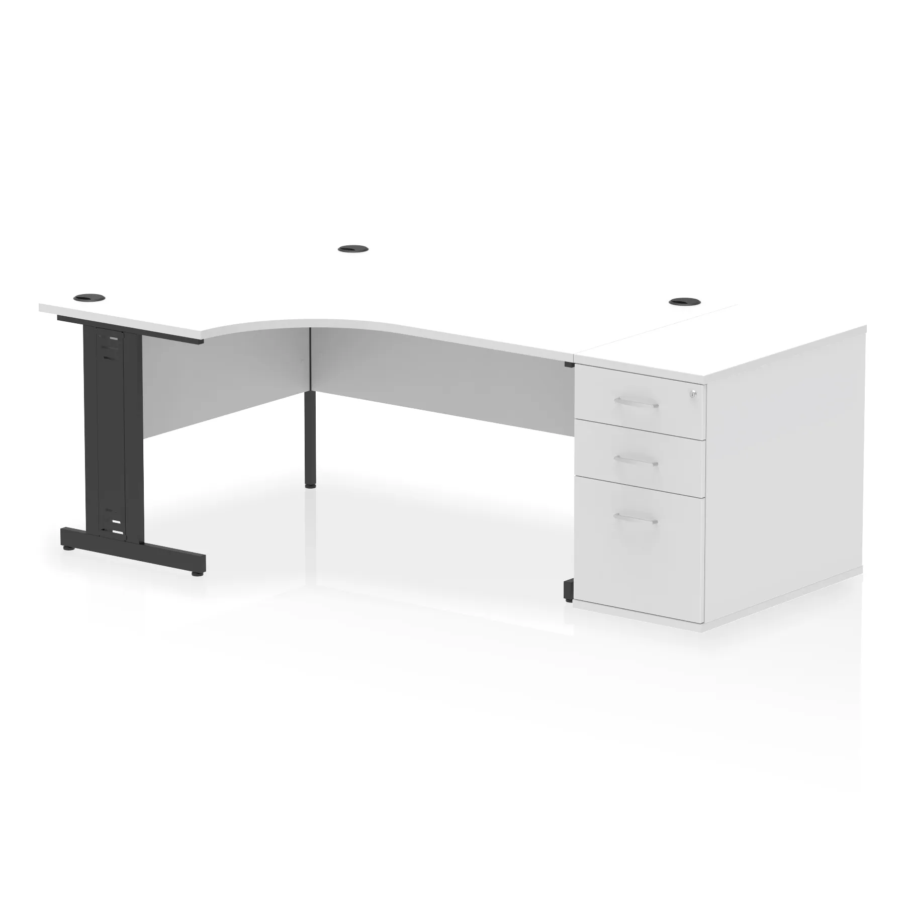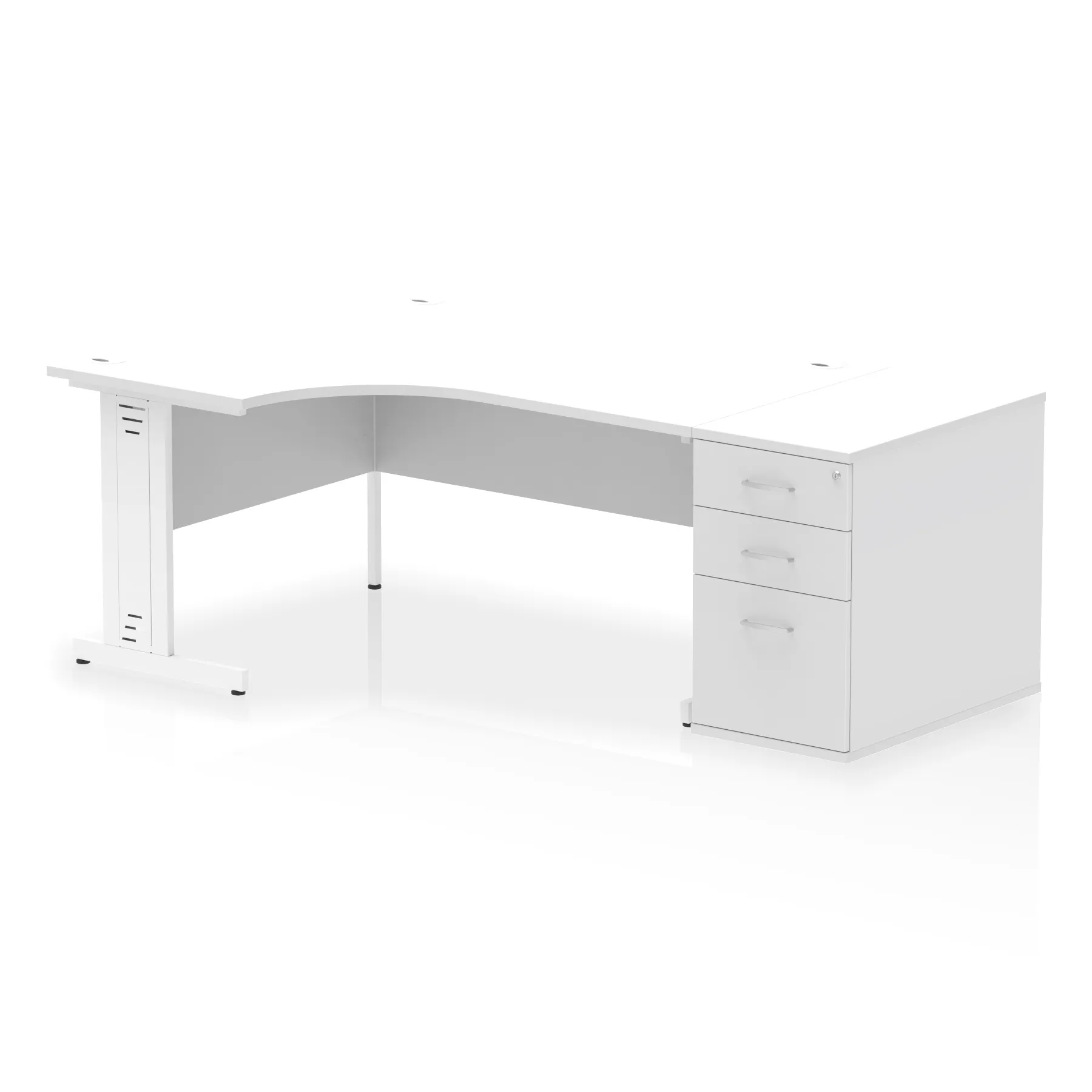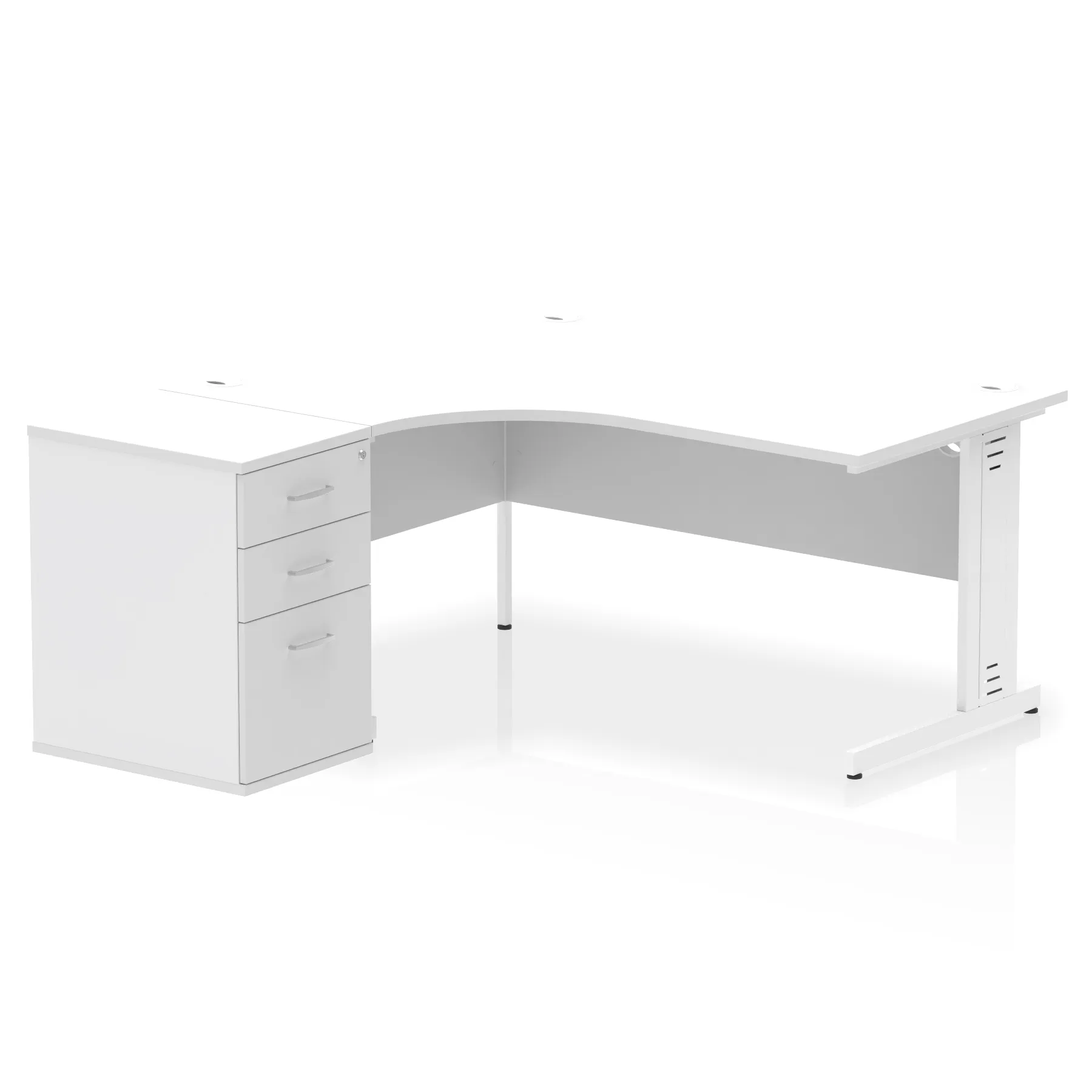 • Impulse contract workstation • 25mm tops • Desk and pedestal combined • Heat resistant melamine finish • 18mm modesty panel • 2mm protective abs edging • Double strut legs • Multiple cable ports • Height adjustable feet • Steel to steel fixings • Modesty panel slots wire slots • Deep set modesty panel (5″) allows for compatibility of most screen clamp fittings