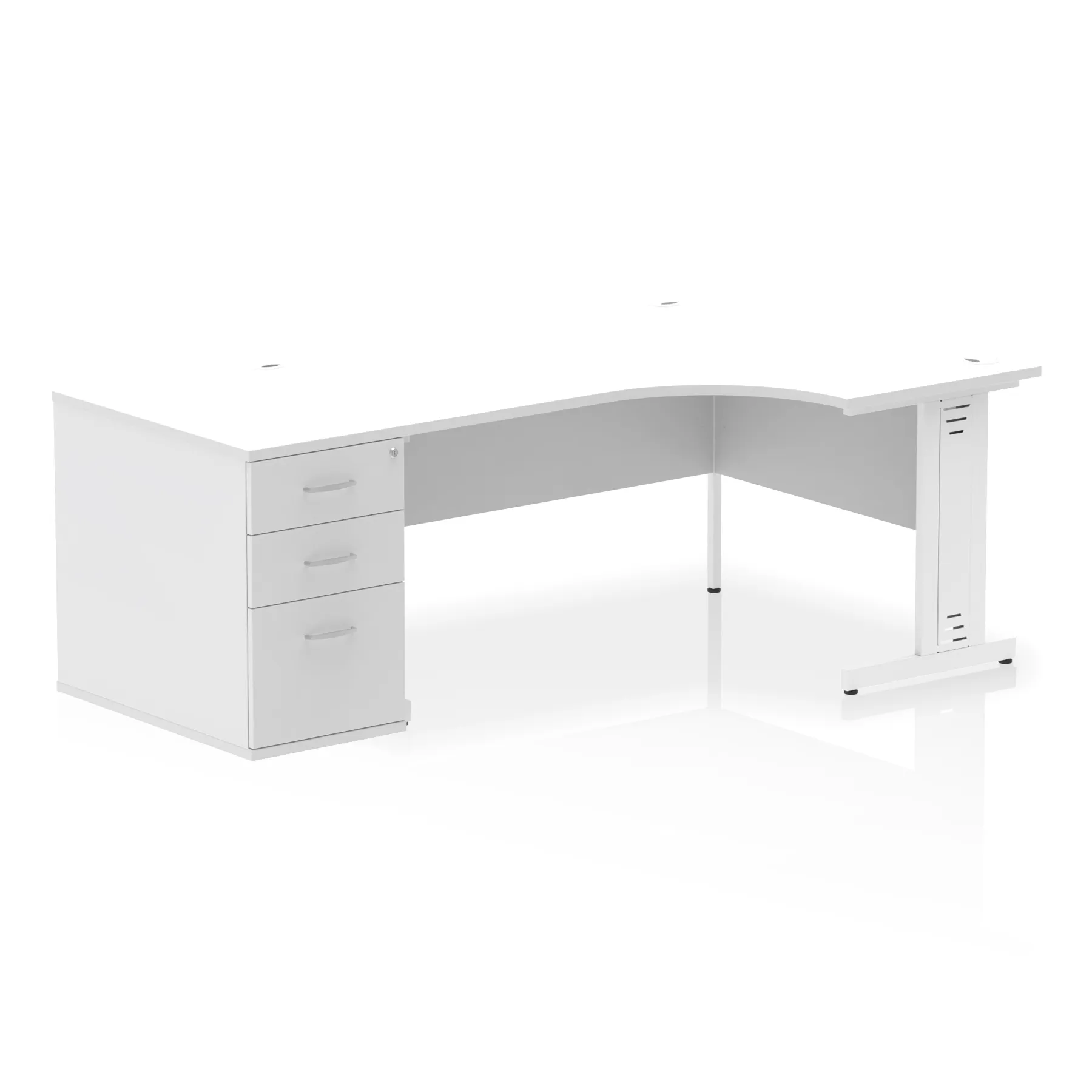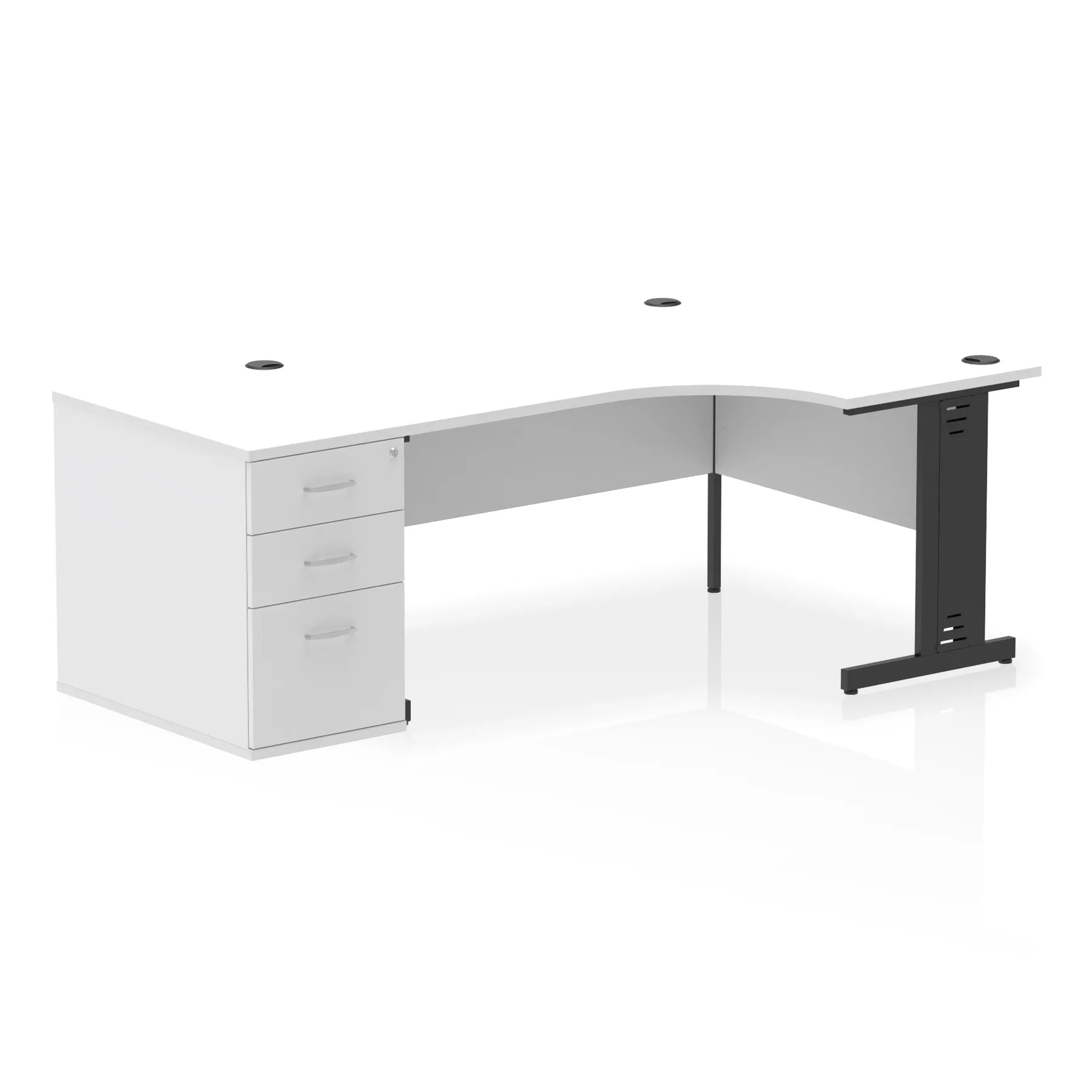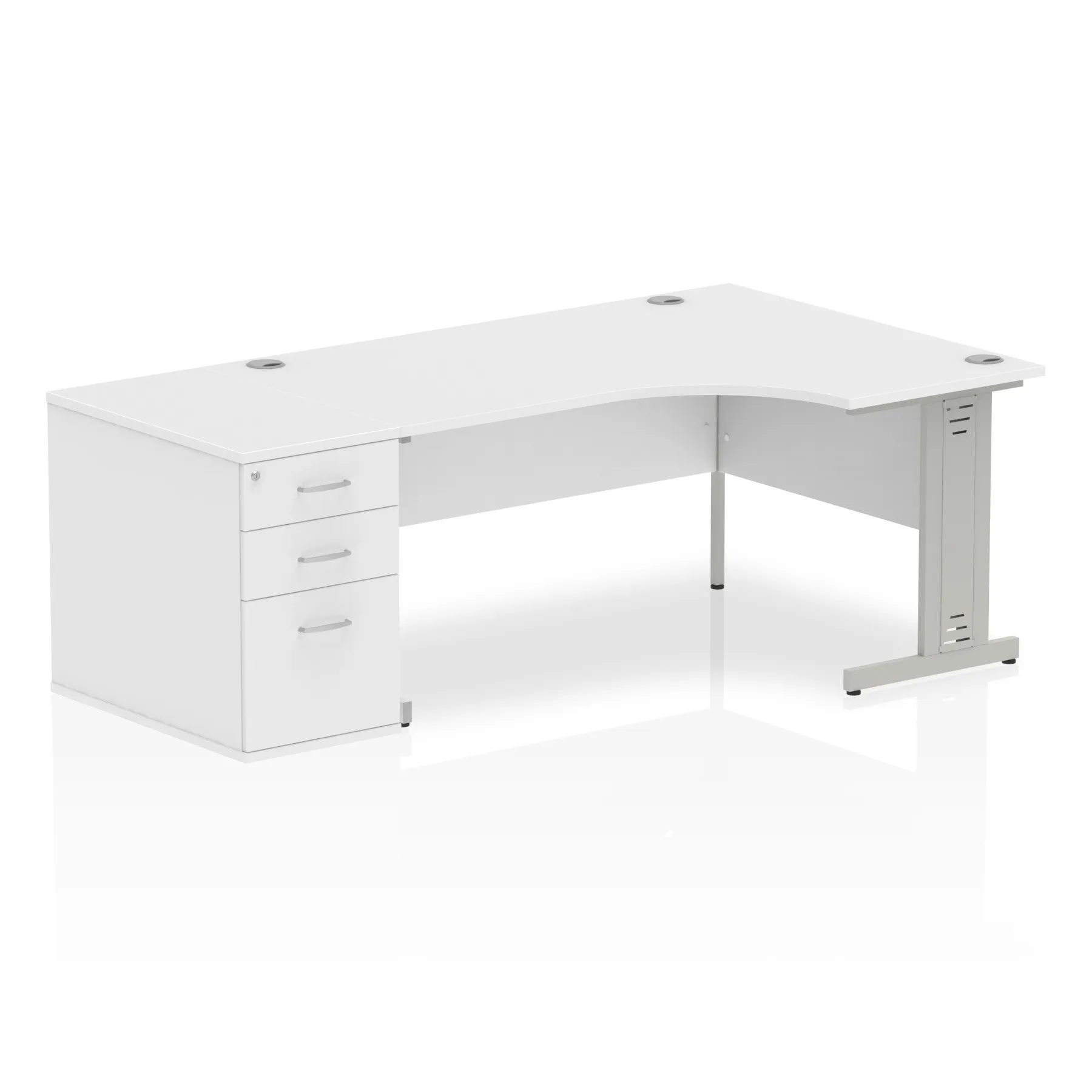 • Impulse contract workstation • 25mm tops • Desk and pedestal combined • Heat resistant melamine finish • 18mm modesty panel • 2mm protective abs edging • Double strut legs • Multiple cable ports • Height adjustable feet • Steel to steel fixings • Modesty panel slots wire slots • Deep set modesty panel (5″) allows for compatibility of most screen clamp fittings