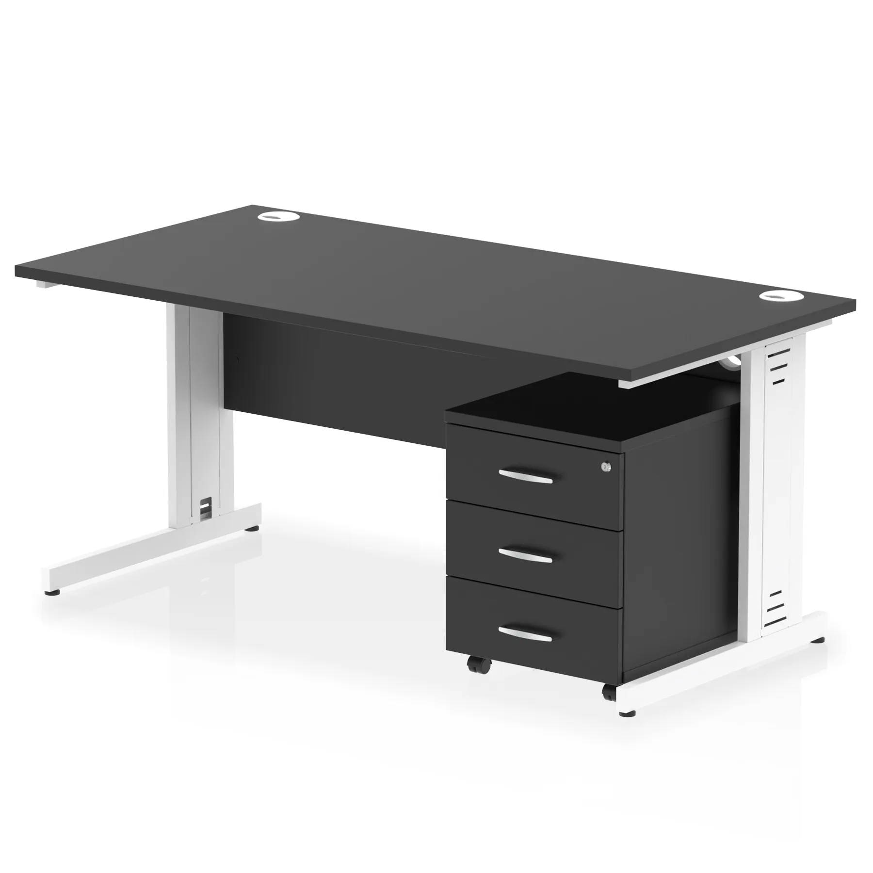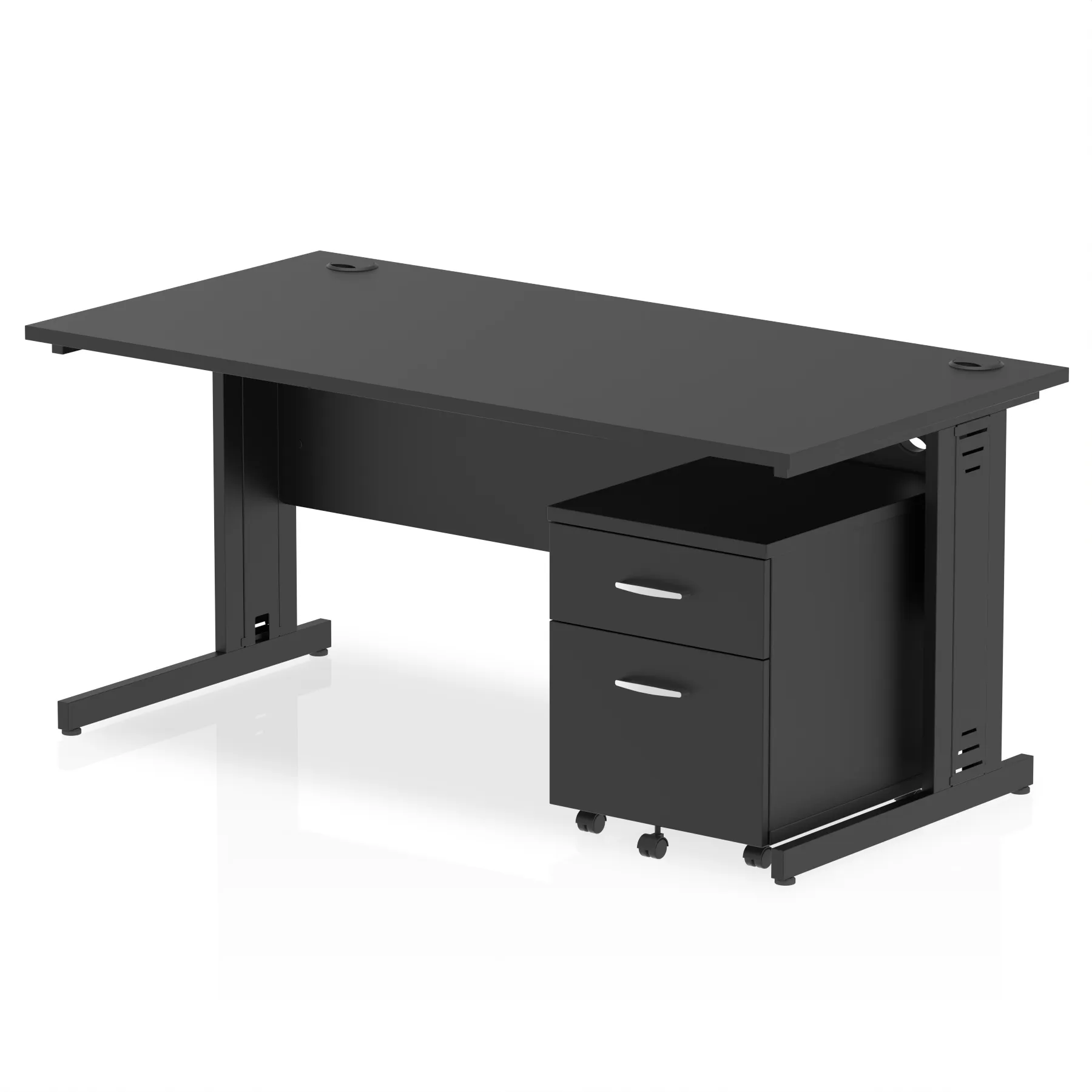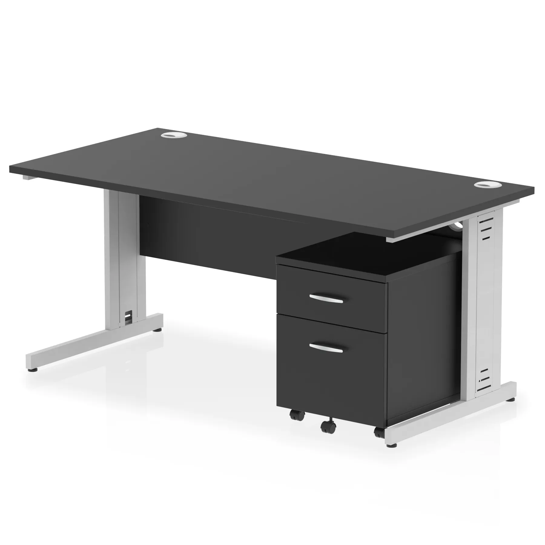 Impulse contract workstation | 25mm tops | Desk and pedestal combined | Heat resistant beech melamine finish | 18mm modesty panel | 2mm protective abs edging | Silver coated double strut legs with cable management | Multiple cable ports | Height adjustable feet | Steel to steel fixings | Modesty panel slots wire slots | Deep set modesty panel (5″) allows for compatibility of most screen clamp fittings