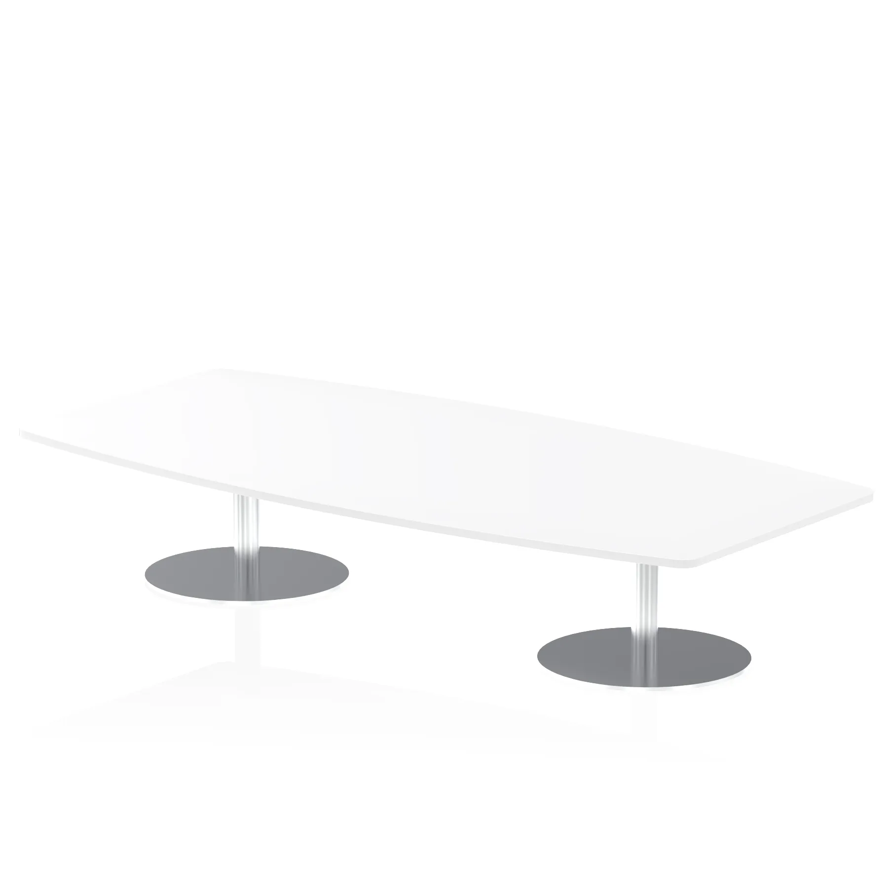 25mm thick desk top profile | Dual, brushed stainless steel effect circular base (580mm diameter) | Brushed stainless steel pillars (76mm diameter) | Weighted base provides stability | Writable desk surface
