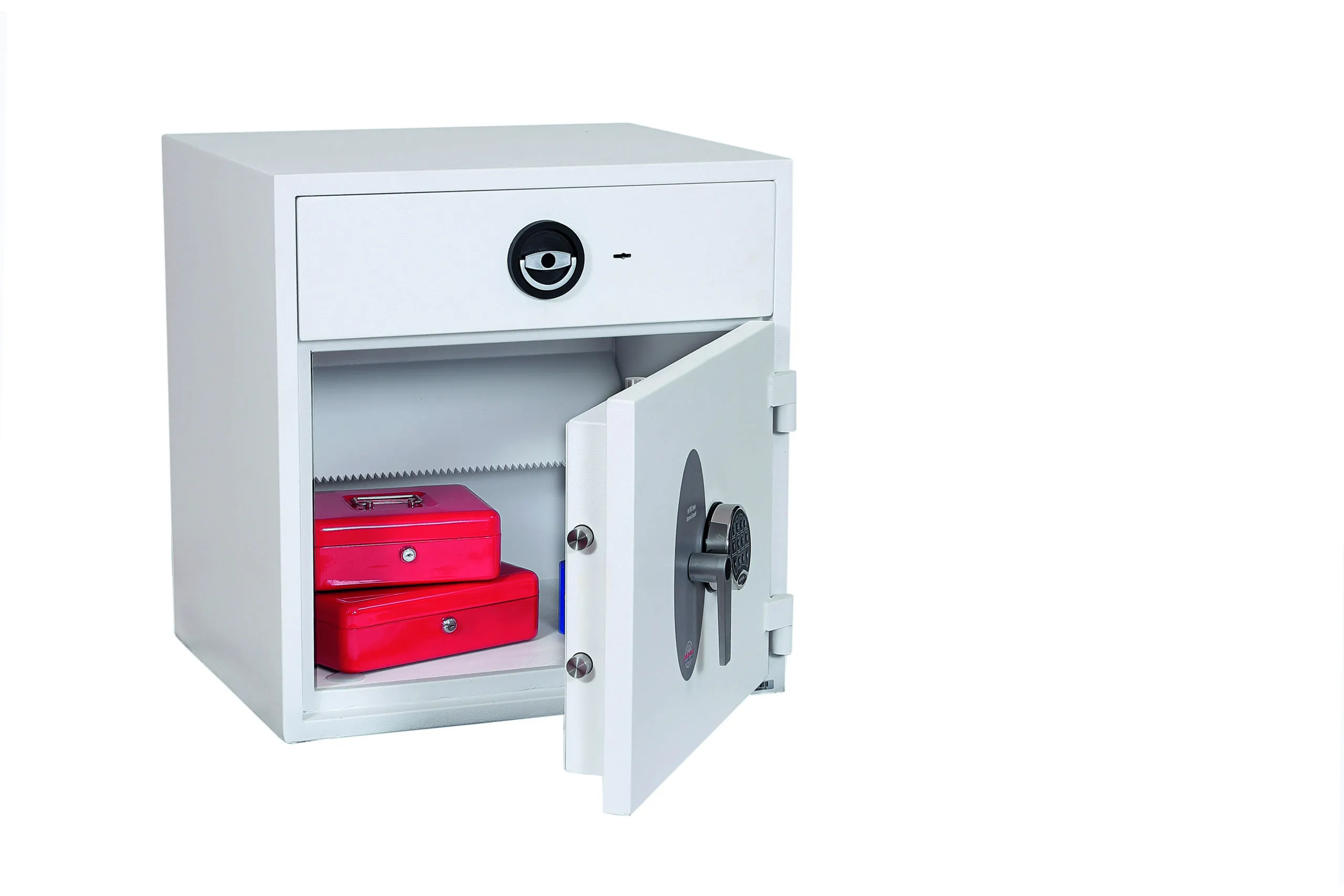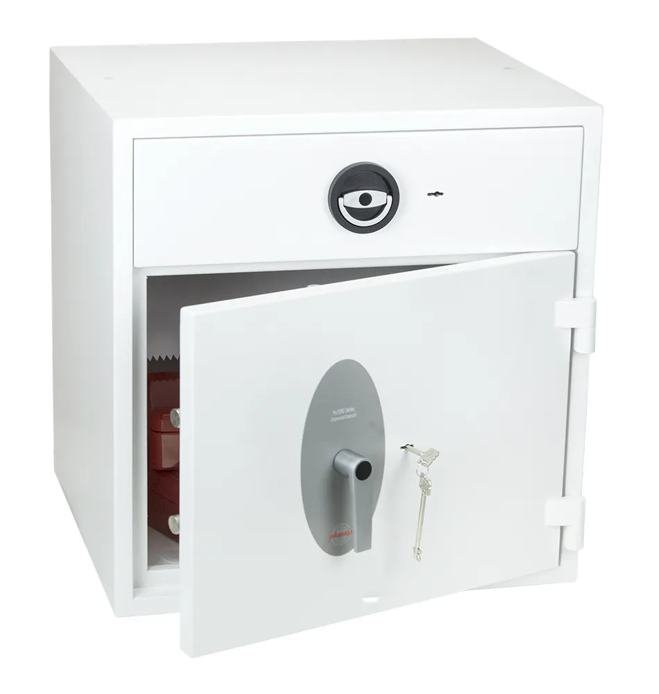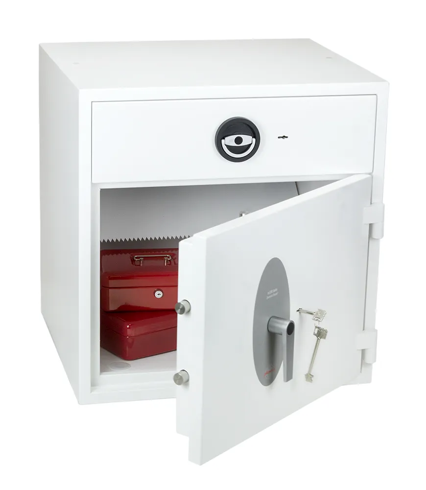 SECURITY PROTECTION – Tested to the prestigious European EN1143-2:2014 Security standard, Grade D1 (ECB.S Certified) giving cash cover of £10,000 or valuables cover of £100,000 | APPROVALS – UK Police approved (Secured by Design scheme) and the Association of Insurance Surveyors (AiS) | DRAWER DEPOSIT – High security pull out drawer deposit with special baffle drop system for maximum security. The drawer deposit is secured by multiple locking bolts and locked with a high security double bitted VdS class I key lock | CONSTRUCTION – Double wall composite construction, anti drill plates and re-locker protection for the door provide a safe of great strength | FIXING – Ready prepared for floor fixing, with fixing bolts for concrete floors supplied | COLOUR – Finished in a high quality scratch resistant White paint RAL9003 | Suitable for storage of controlled drugs whose active ingredients exceed 500 grams