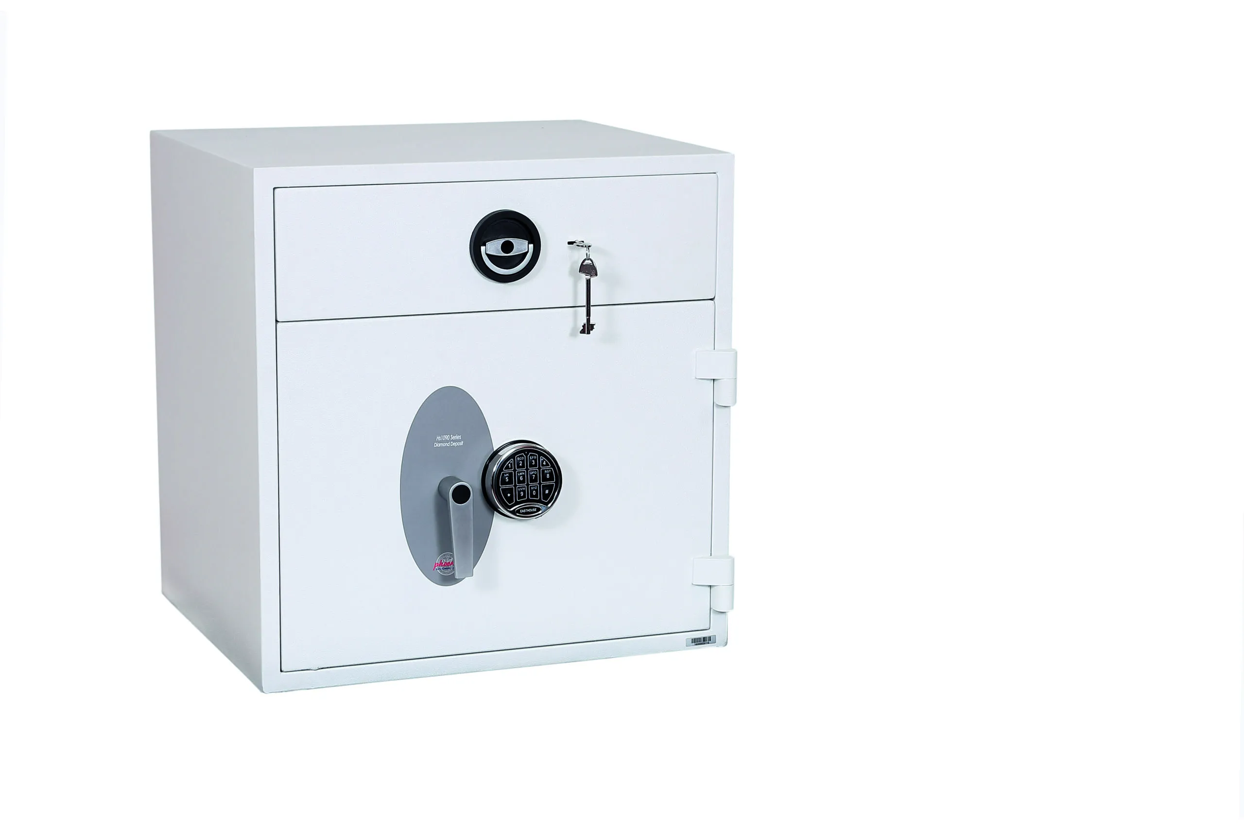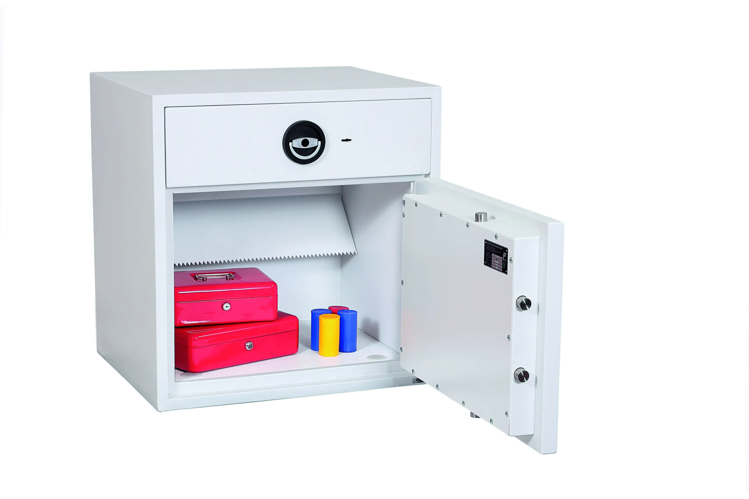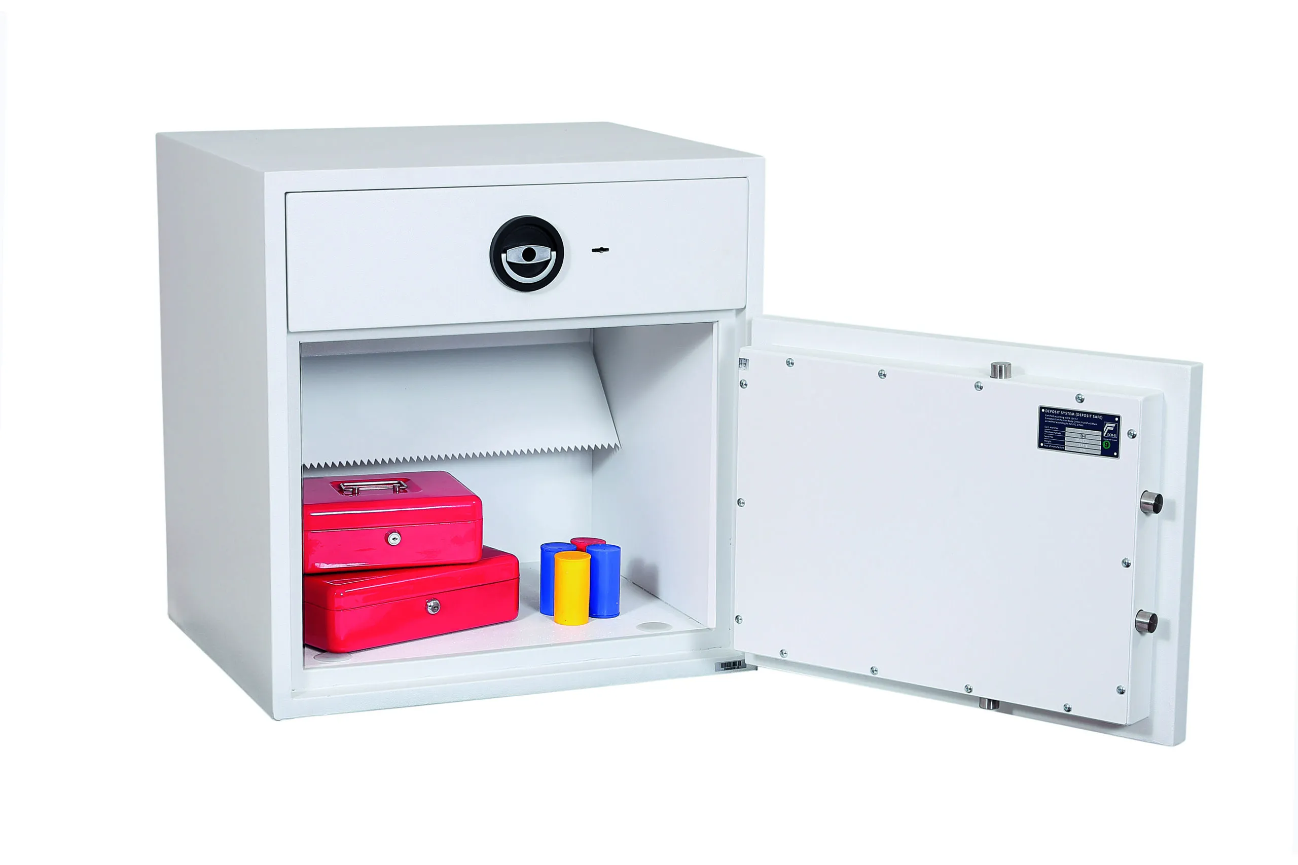 SECURITY PROTECTION – Tested to the prestigious European EN1143-2:2014 Security standard, Grade D1 (ECB.S Certified) giving cash cover of £10,000 or valuables cover of £100,000 | APPROVALS – UK Police approved (Secured by Design scheme) and the Association of Insurance Surveyors (AiS) | DRAWER DEPOSIT – High security pull out drawer deposit with special baffle drop system for maximum security. The drawer deposit is secured by multiple locking bolts and locked with a high security double bitted VdS class I key lock | CONSTRUCTION – Double wall composite construction, anti drill plates and re-locker protection for the door provide a safe of great strength | FIXING – Ready prepared for floor fixing, with fixing bolts for concrete floors supplied | COLOUR – Finished in a high quality scratch resistant White paint RAL9003 | Suitable for storage of controlled drugs whose active ingredients exceed 500 grams