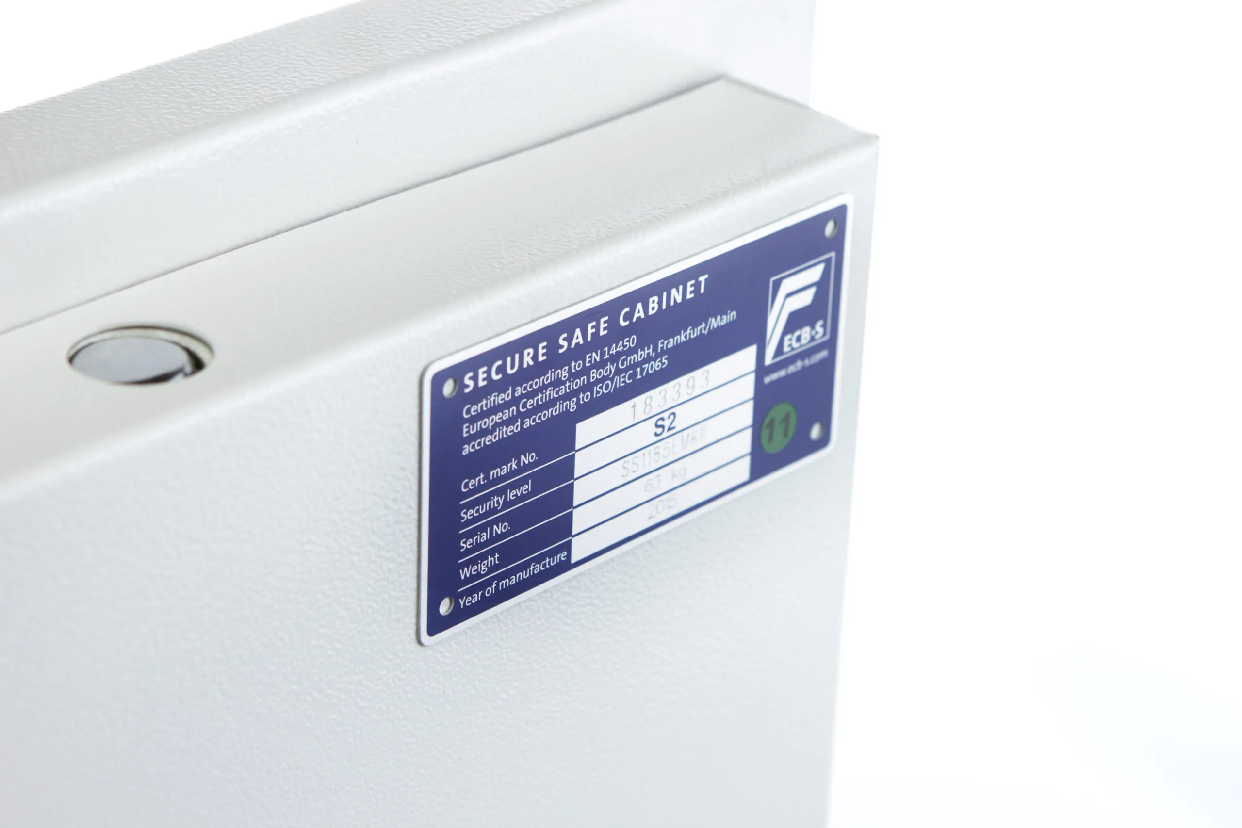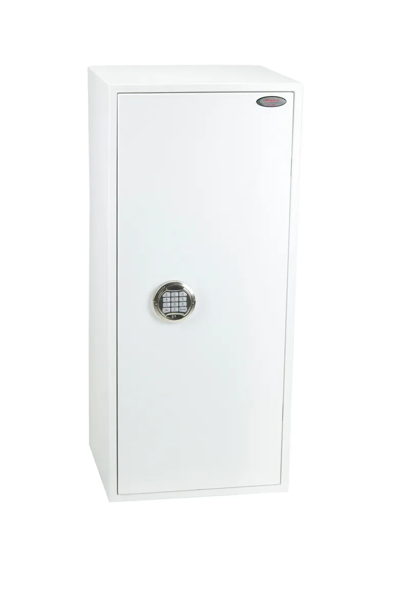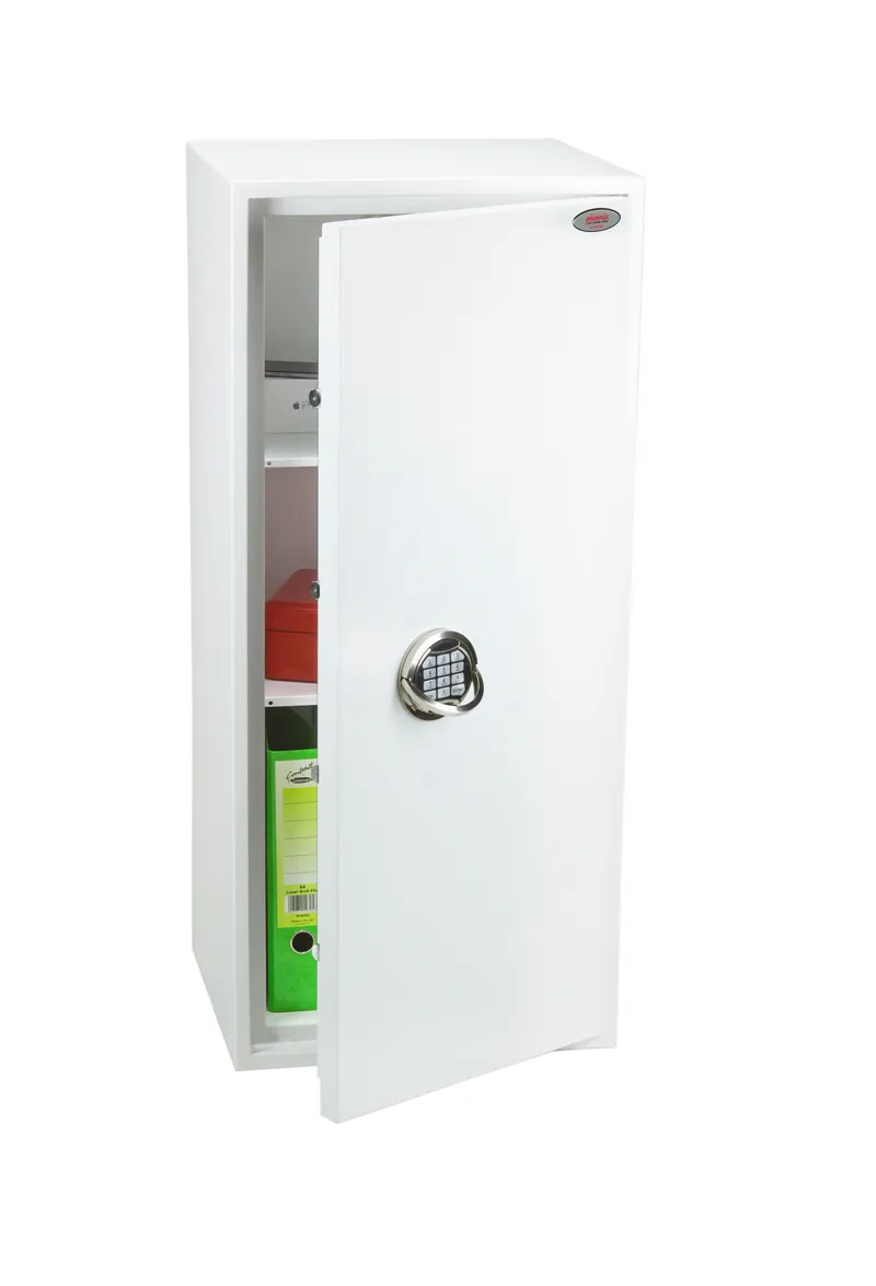 SECURITY PROTECTION – Tested to the prestigious European S2 Security standard (EN14450 – ECB.S Certified) giving cash cover of £4,000 or Valuables cover of £40,000 | APPROVALS – UK Police approved (Secured by Design scheme) and the Association of Insurance Surveyors (AiS) | CONSTRUCTION – Double wall construction with anti drill plates and re-locker protection for the door provide a safe of great strength | FIXING – Ready prepared for floor fixing, with fixing bolts for concrete supplied | COLOUR – Finished in a high quality scratch resistant White paint RAL9003 | Suitable for storage of controlled drugs whose active ingredients do not exceed 500 grams