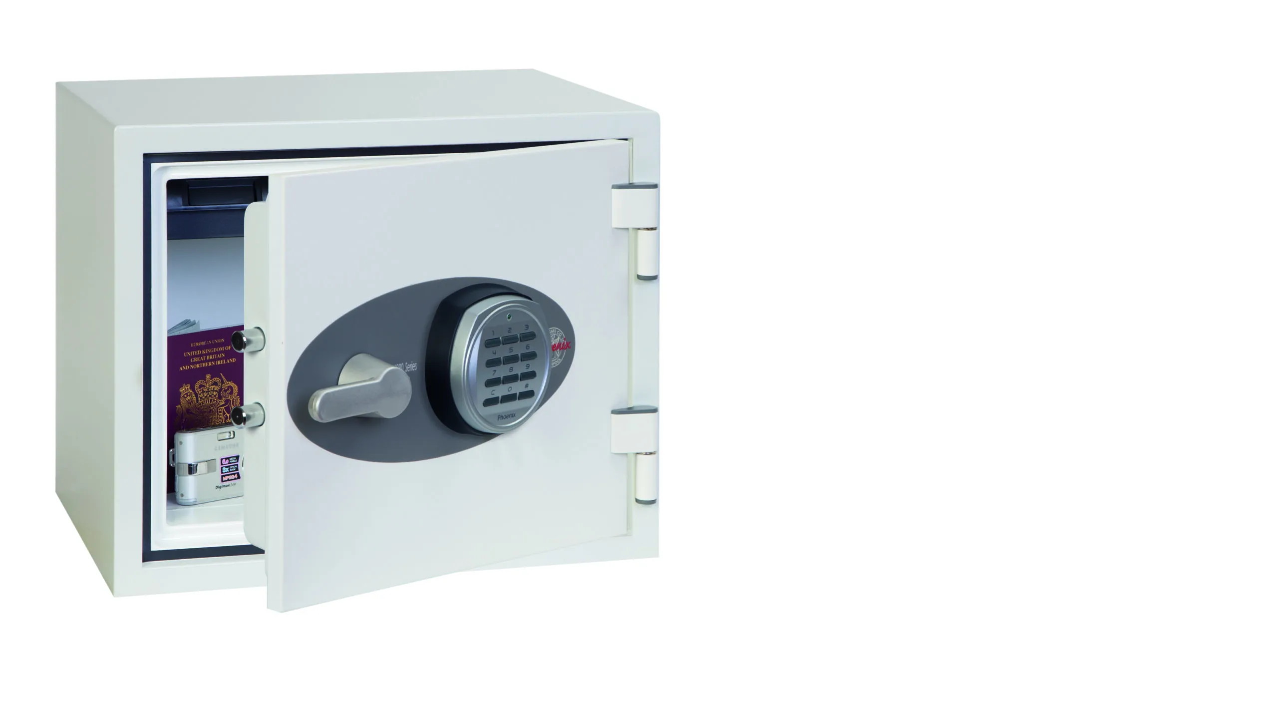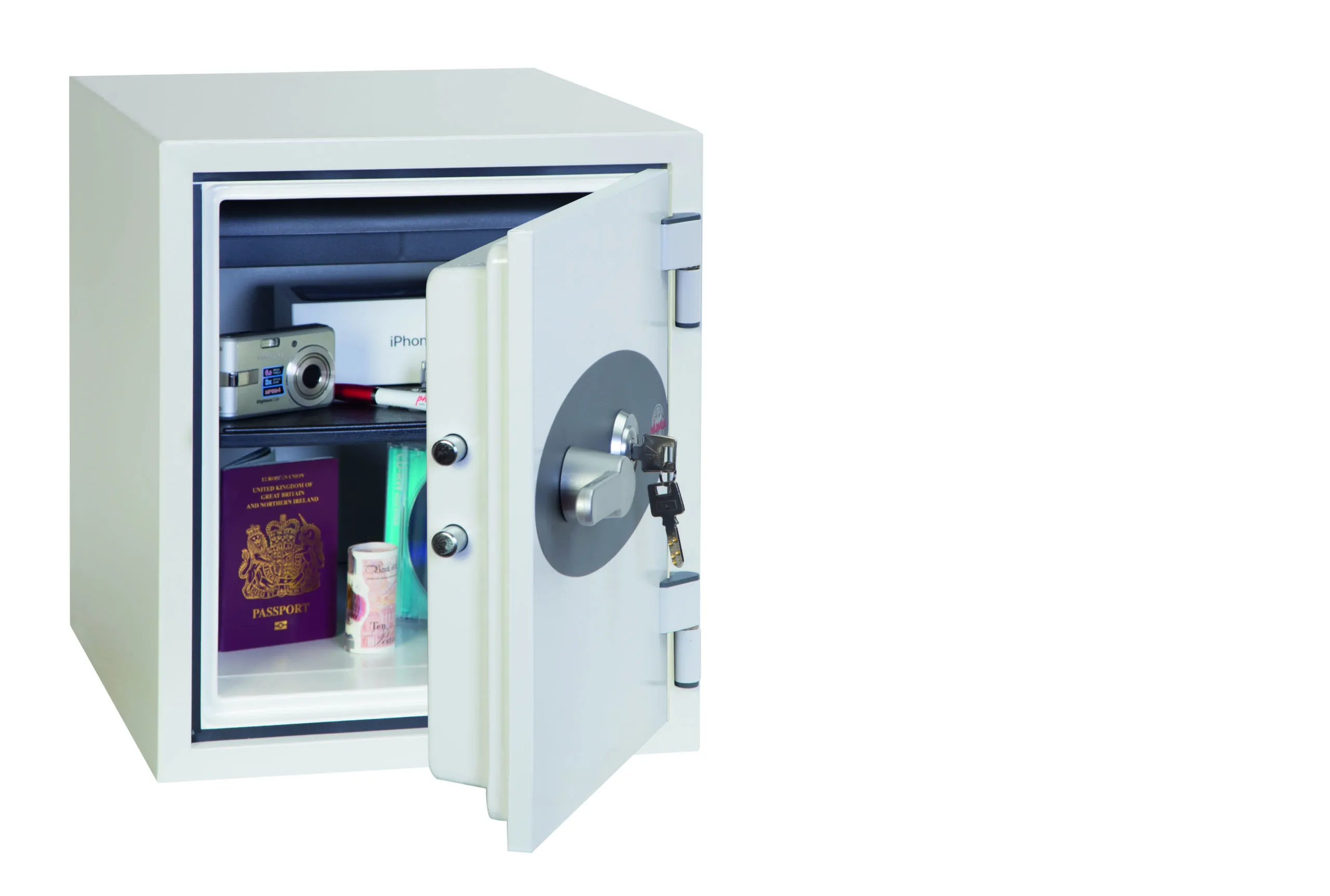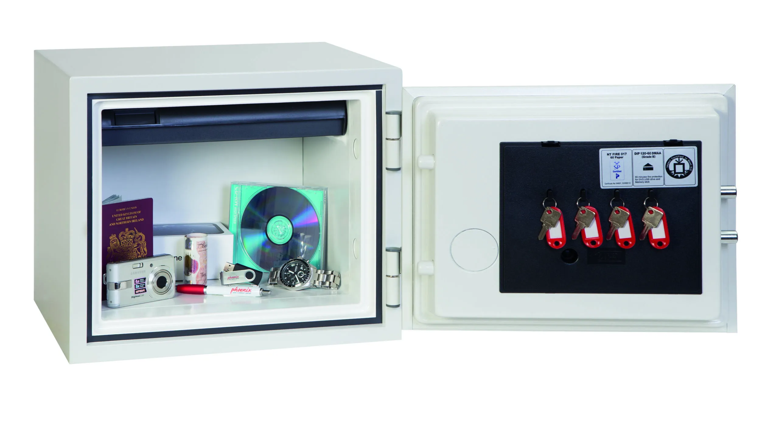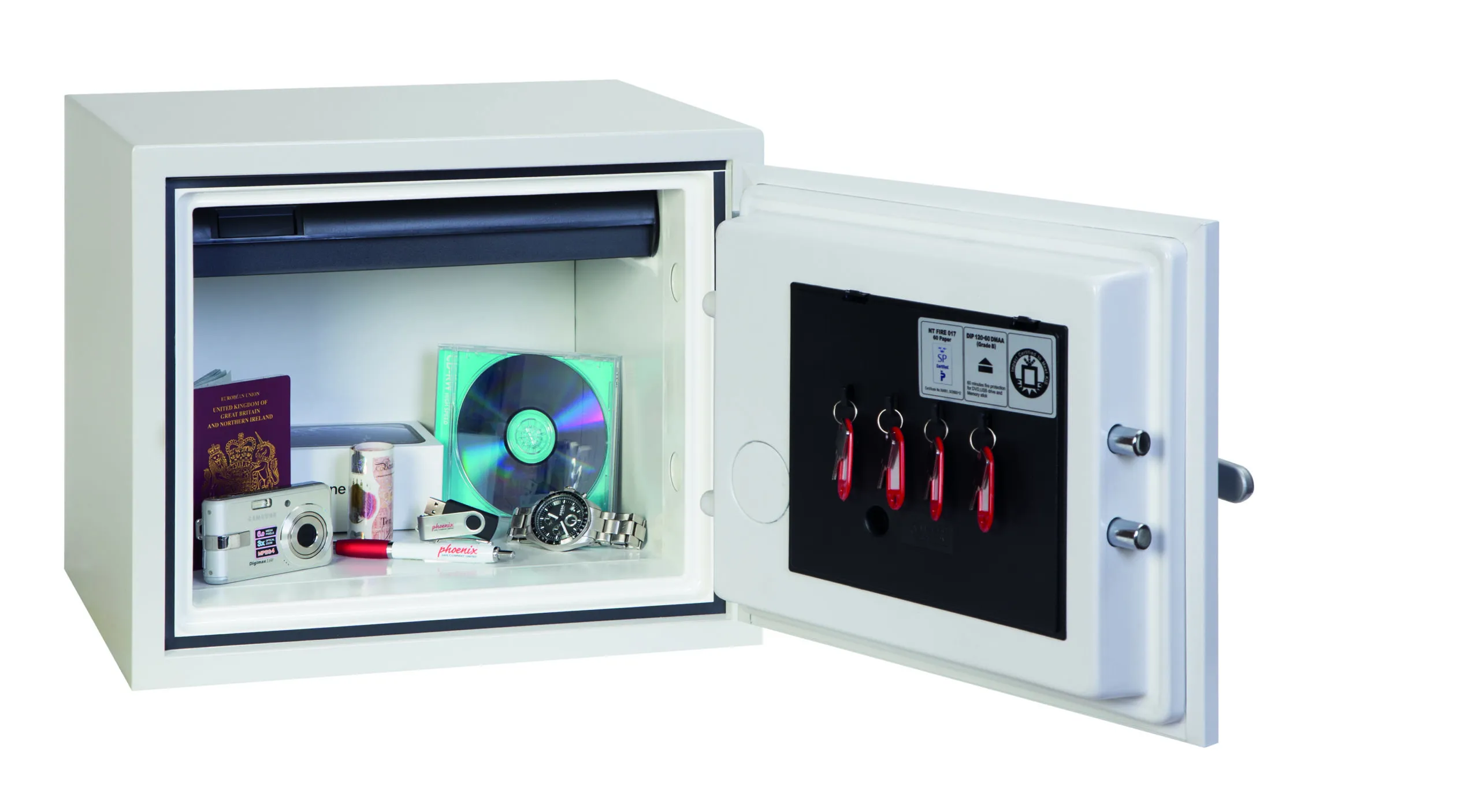 FIRE PROTECTION (PAPER) – Tested to the International NT Fire 017 – 60 fire test standard, at the Swedish SP Testing Centre providing 60 minutes fire protection for paper documents | FIRE PROTECTION (DIGITAL MEDIA) – Tested to MTC – DIP120 – 60DM fire test standard, providing 60 minutes fire protection for digital media, DVD’s, USB memory sticks & hard drives | SECURITY PROTECTION – The safe is recommended for an overnight cash risk of £2,000.00 or £20,000.00 valuables and is also ready prepared for floor fixing, with fixing bolts for concrete floors supplied | DROP TEST – Drop tested from 9.1 metres for resistance to the impact of falling through the burning floors of a building or the collapse of the building | SPECIAL FEATURES – Supplied with 4 internal key hooks, pull out drawer and (for Size 2 or 3) height adjustable shelf | COLOUR – Finished in a high quality scratch resistant paint RAL9003 White
