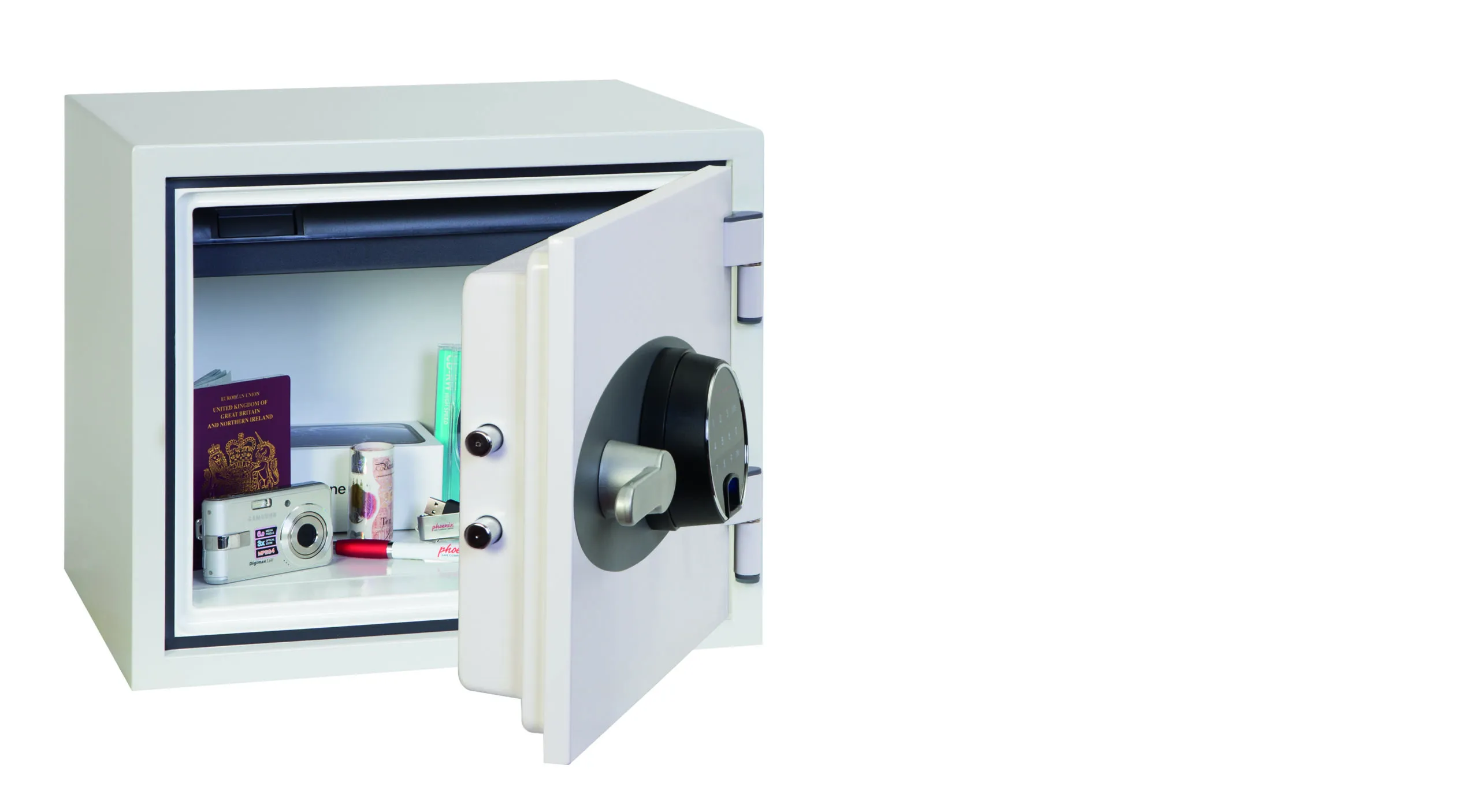 Fingerprint – Fitted with an advanced high security touchscreen keypad & fingerprint lock with clear LED display, internal alarm, dual control, hidden code and scrambled code that can be programmed as standard with up to 128 fingerprints